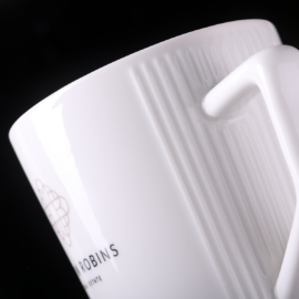Tasse originale en porcelaine de haute qualité. Elle possède des embossages design des deux côtés de l’anse. Son anse au design unique la distingue.