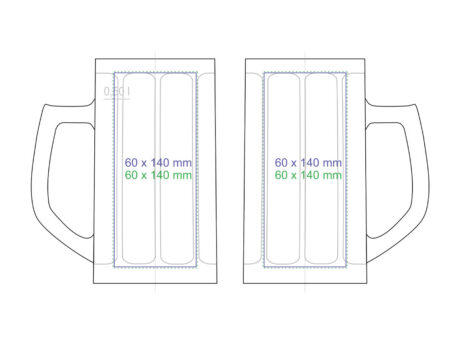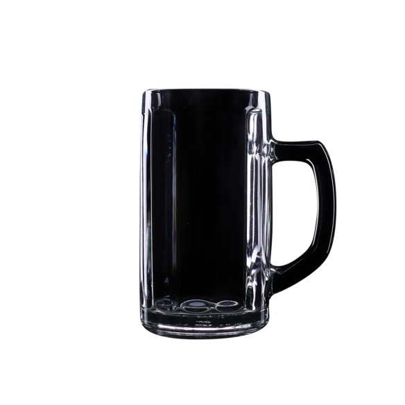 Une large chope a biere simple produite en Europe. Elle possede une anse ergonomique et des éléments décoratifs sur le corps.
