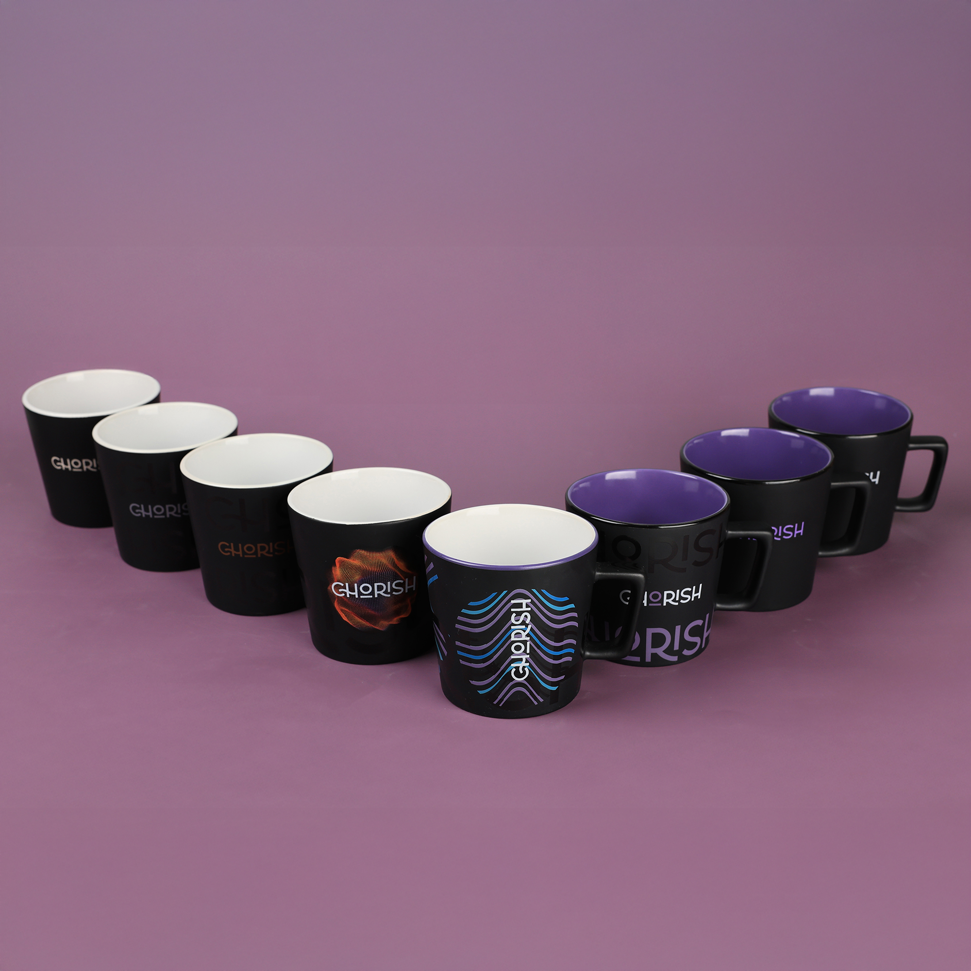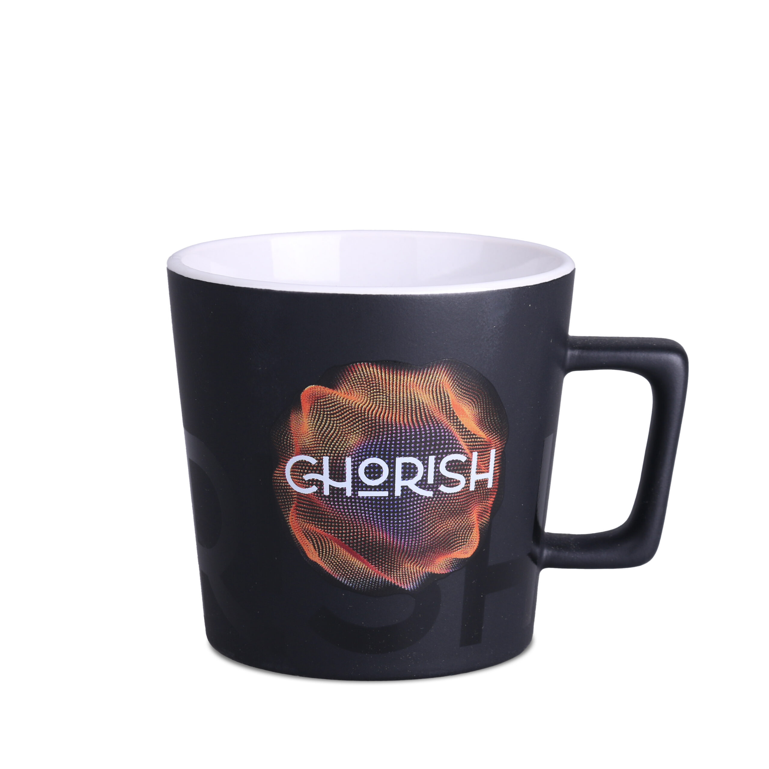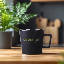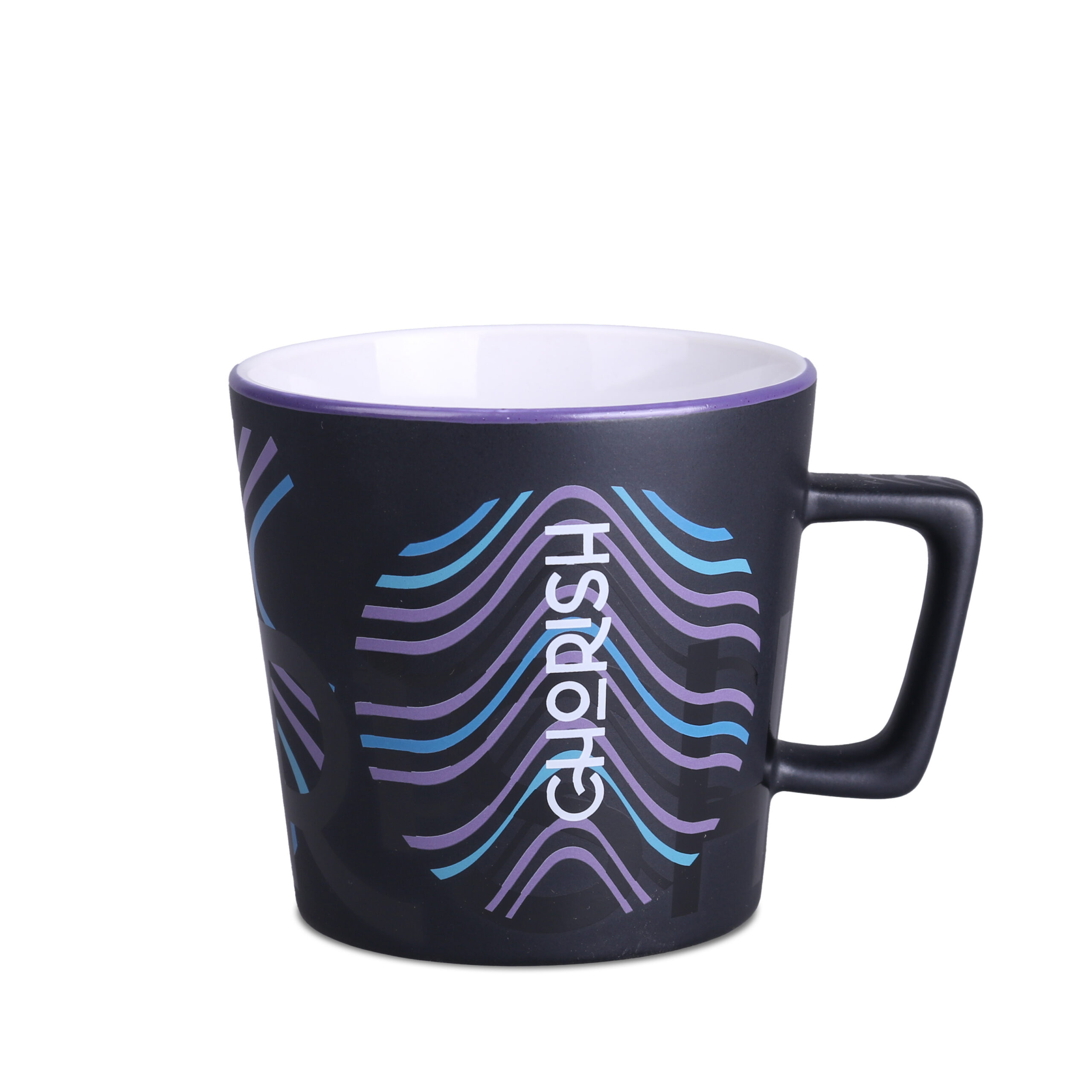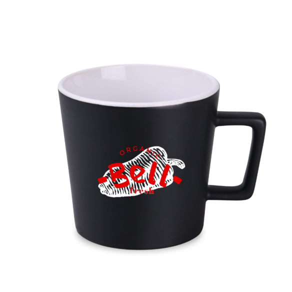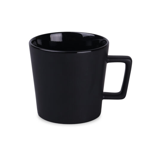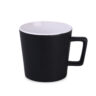 Tasse moderne avec une surface noire mate. Elle dispose d’une anse à la forme intéressante et design. Disponible avec des intérieurs de différentes couleurs.