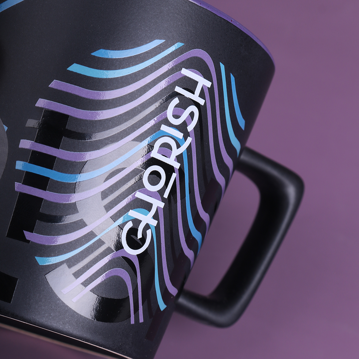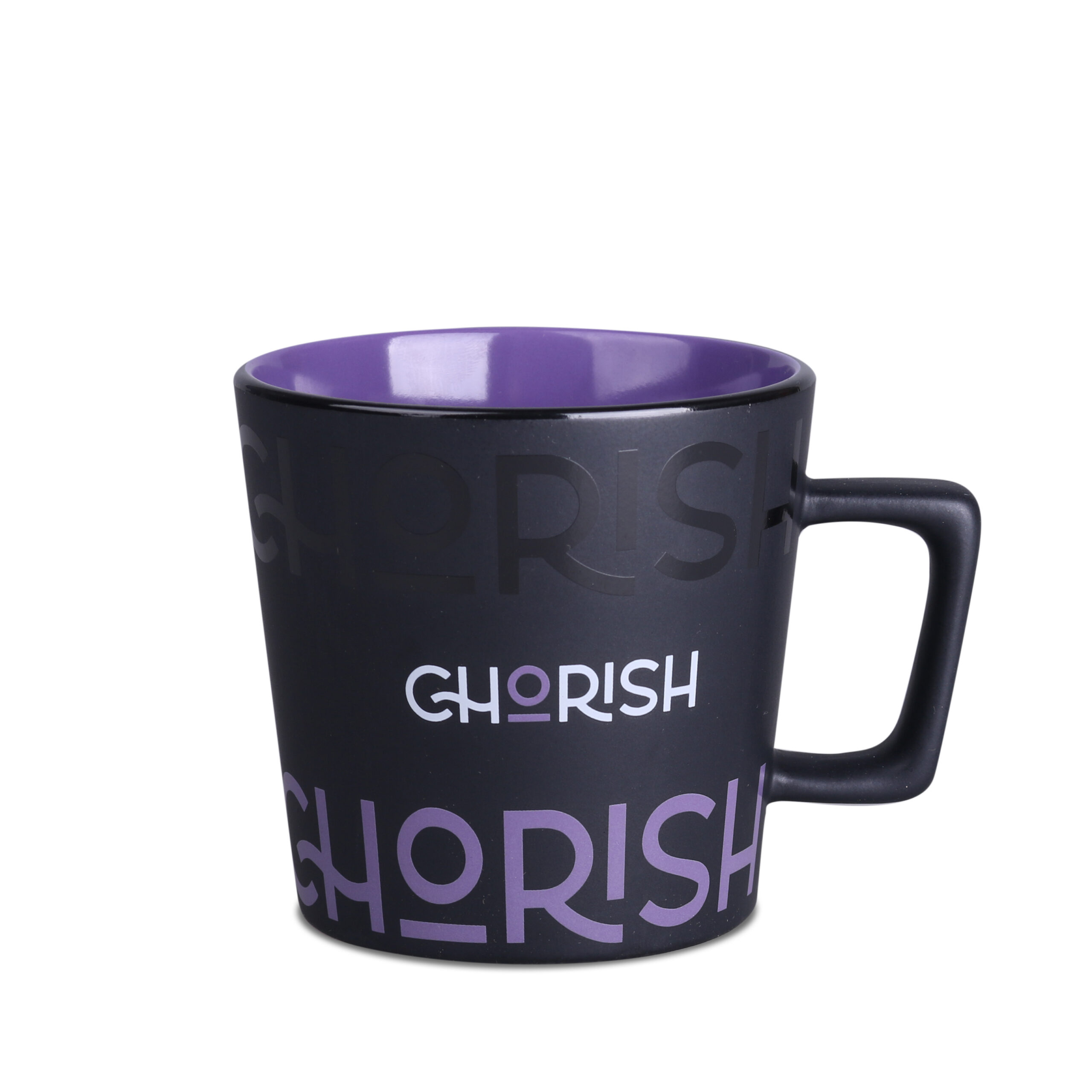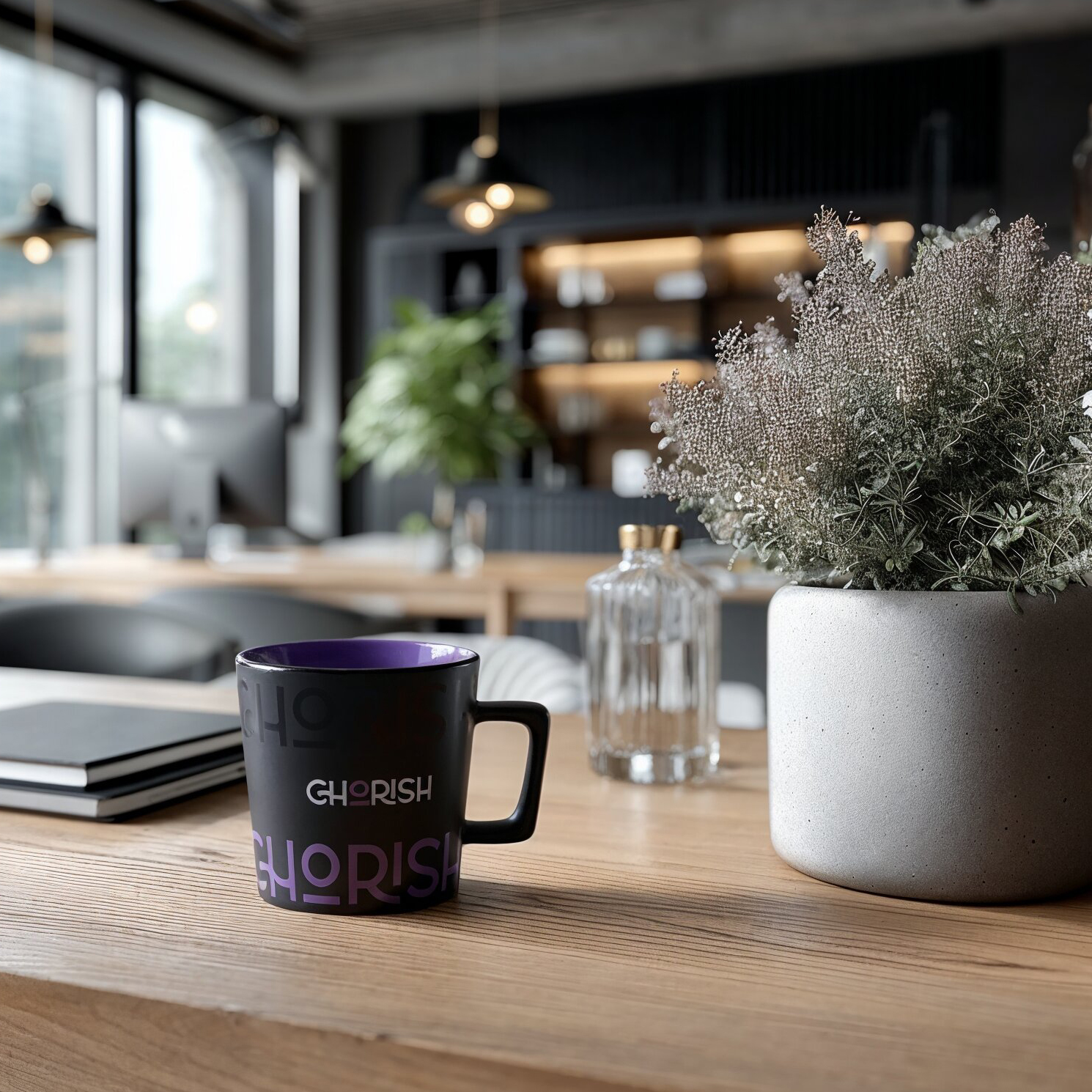 Tasse moderne avec une surface noire mate. Elle dispose d’une anse à la forme intéressante et design. Disponible avec des intérieurs de différentes couleurs.