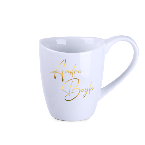 Tasse élégante en porcelaine de qualité supérieure. Elle possede une grande anse assortie.